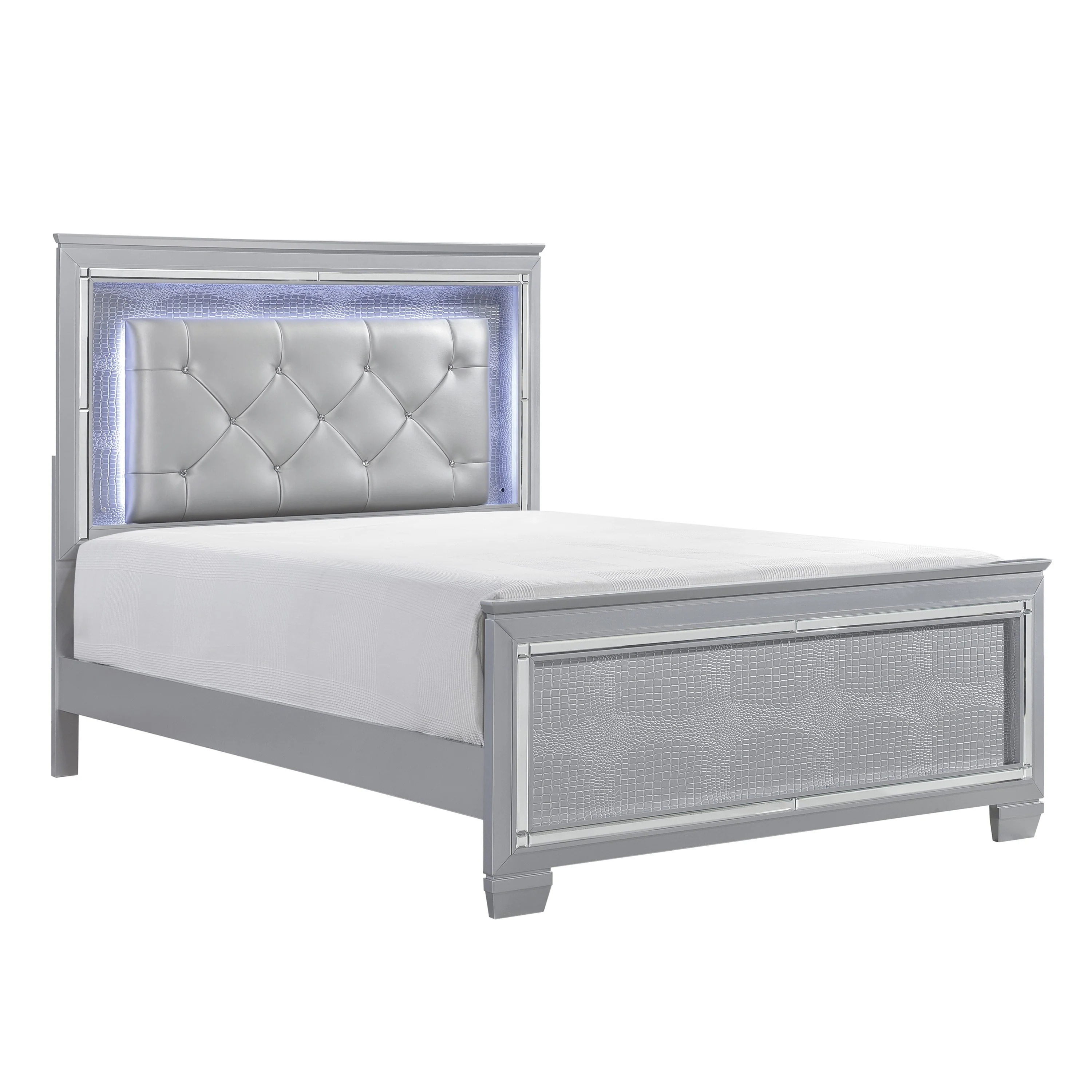 Glamour reigns in the design of the Allura Collection. Framing each piece is a decorative beveled mirror accent that enhances the illumination from the touch-engaged LED backlight of the headboard and mirror, as well as the under-light of the night stand. Alligator embossing and high polished crystal-enhanced hardware boldly accent the silver finish as does the silver faux leather crystal-tufted headboard insert of the collection. None