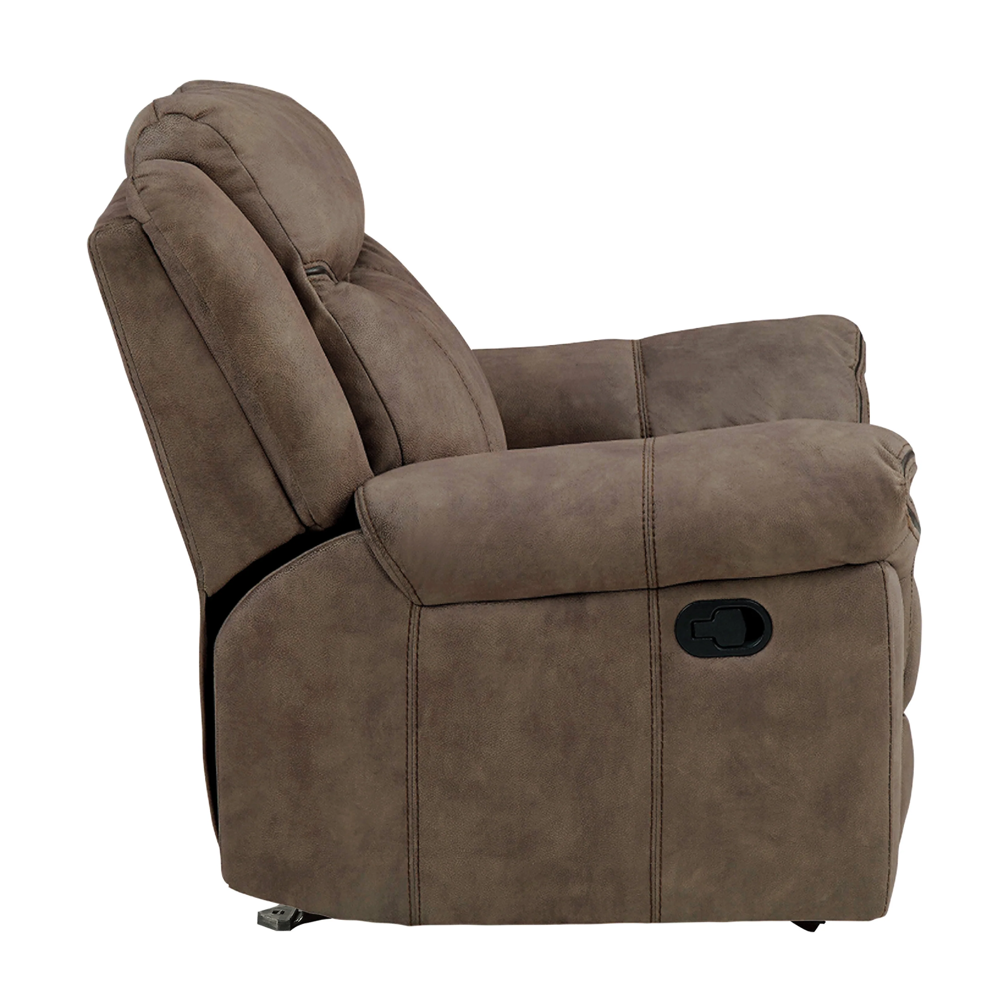 With amply appointed offerings that create not only a comfortable seating experience but a functional one as well, the Aram Collection will be a welcome addition to your home. The seating group is offered in a brown polished microfiber for comfort and style that will blend effortlessly with your transitional decorative preference. Manual motion mechanisms operate with the pull of a side-mounted tab, that once engaged, take you from seated to reclined in an easy motion. The reclining chair features a glider mechanism that allows for easy back and forth motion. 42 x 39 x 41H