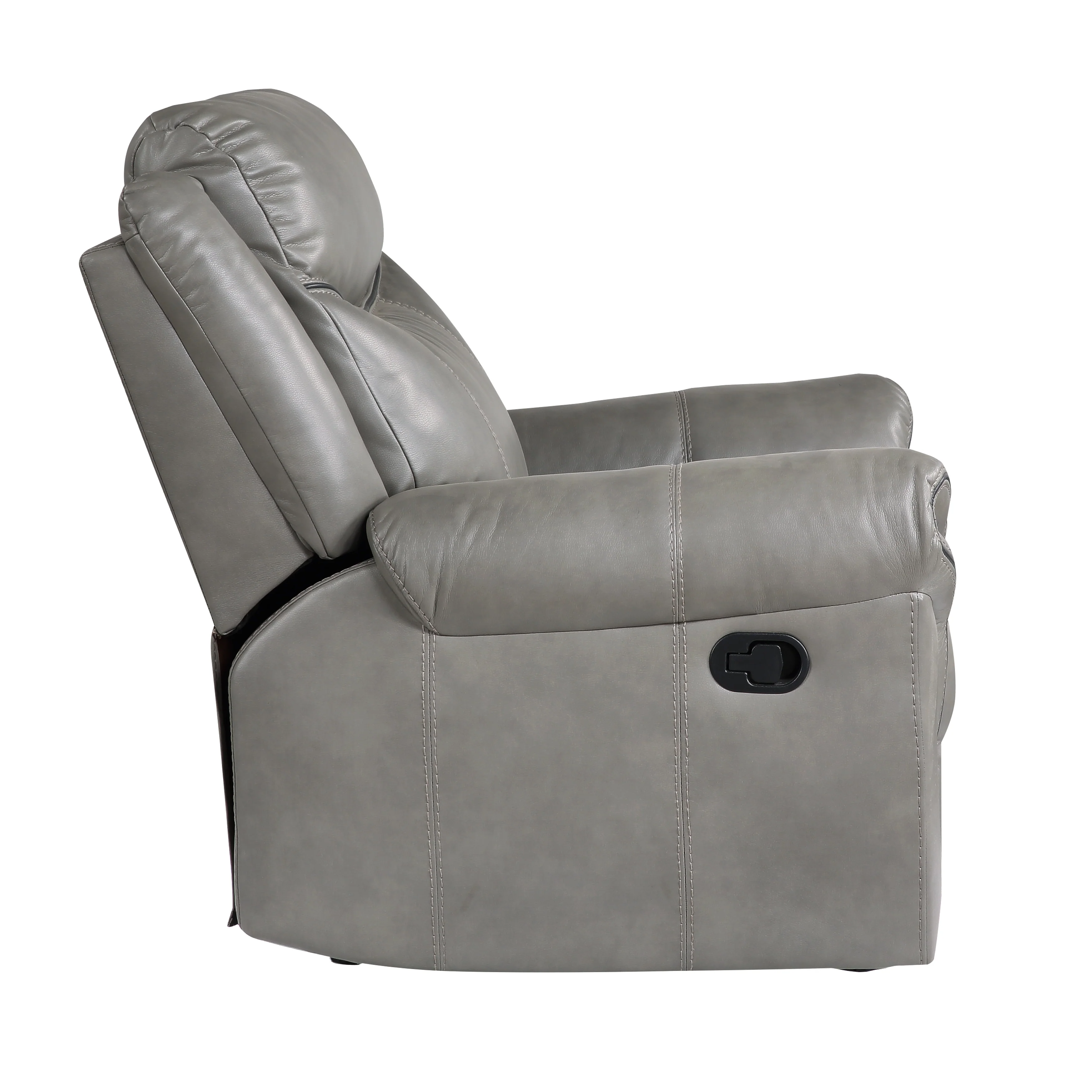Plush seating and versatile styling blend effortlessly to create the look of the Aram Collection. The gray breathable faux leather upholstery covering will pair perfectly with your transitional decorative preference. The glider reclining chair features a manual motion reclining mechanism which operates with the pull of a side-mounted tab, that once engaged, take you from seated to reclined in an easy motion. 42 x 39 x 41H
