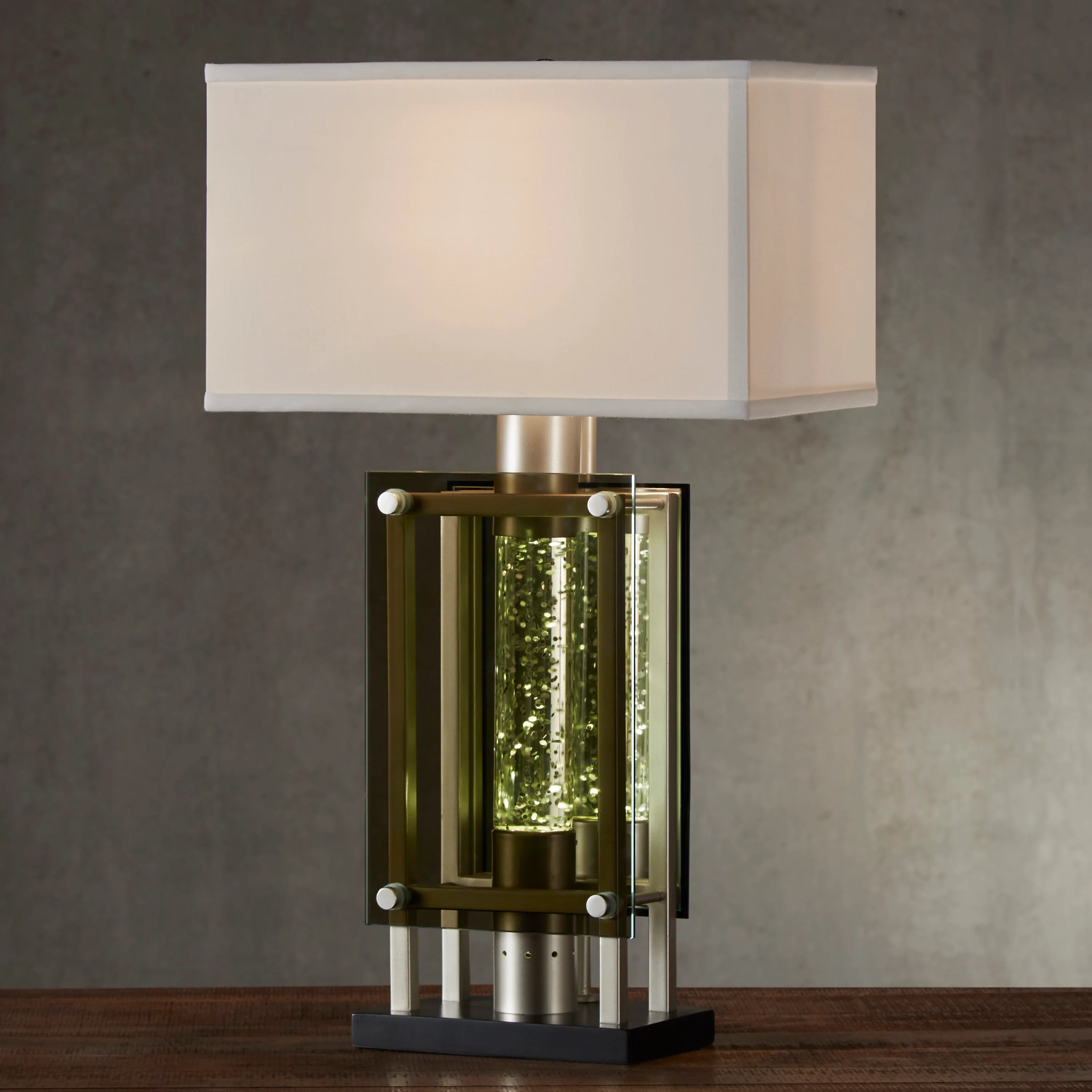 This accent lighting can change the ambiance of any room. Its ultra modern design showcases sparkling decorative mood light, with tiny rippling water-droplets to simulate the soothing dancing water motion. Beautifully crafted stand features high quality satin nickel finish metal and glass, and an elegant rectangular lamp shade on black base. Great addition piece on your night stand, end table, or sofa table. It offers flexible lighting solution: a table lamp with a main light that is suitable for reading, perfect for a night light, and to create the mood in any room. 16 x 10.5 x 27H